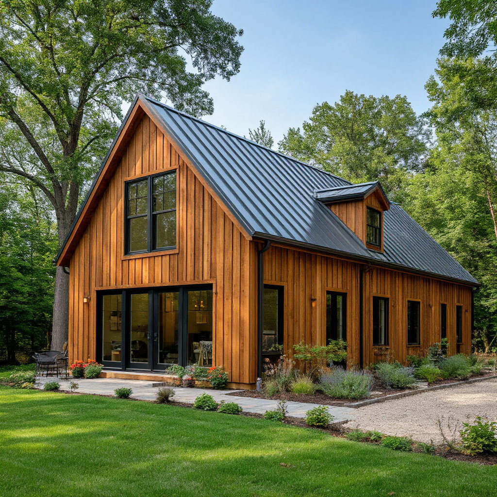 Барнхаусы выглядят минималистично и эффектно. Простая форма и панорамные окна создают ощущение простора, а интерьер легко адаптируется под стиль лофт, минимализм или эко.